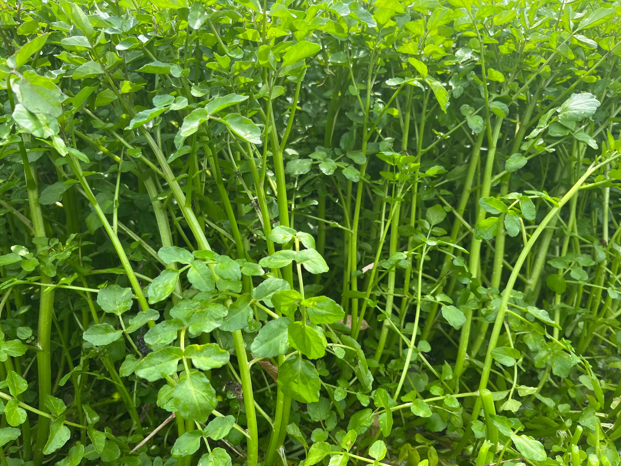スマートファームー伊自良さすてな農園では、夏クレソンが育っています。葉っぱが大きか、フレッシュなクレソンが、山からの清涼な水を浴びながら育っています。必須栄養素No1野菜クレソンを食べて、暑い夏を乗り越えましよう。