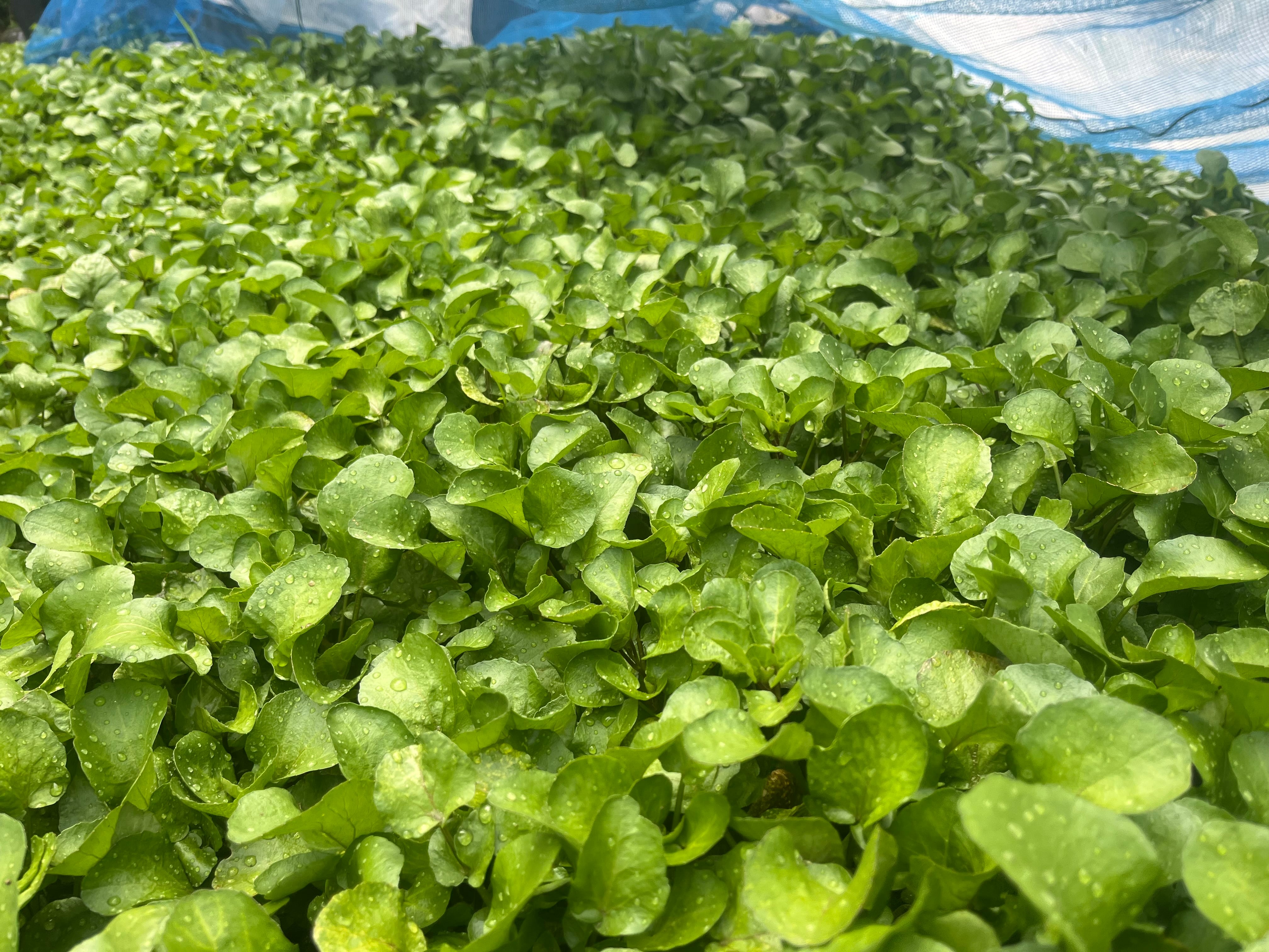 葉が丸くて大きくてフレッシュな苦辛味が特徴です。朝摘みを出荷いたします。